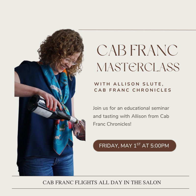 Join us for an educational seminar on Cabernet Franc with Allison Slute, a 17-year wine professional and the foremost authority on Cabernet Franc. Cab Franc Chronicles is her passion project and a celebration of the humble Cabernet Franc grape around the world.
